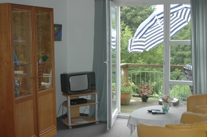 Ferienwohnung “Wesertal”: Wohn- Schlafzimmer mit zwei Betten, die zusammengestellt werden können und TV, Küchenzeile separat mit 2 Flammenherd, Kühlschrank, Kaffeemaschine und Toaster, Bad mit Dusche und WC, Aussensitzecke direkt vor dem Wohnzimmerbereich.