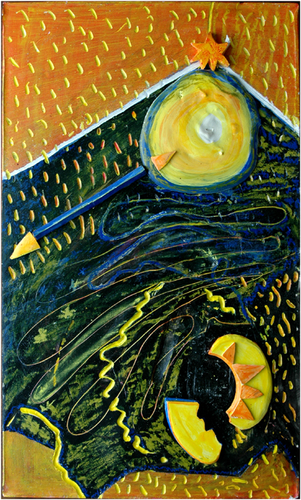 Die hier gezeigten Lichtfänger, sie bestehen aus halbkugelförmigen Schalen aus Kokosfasern zum Teil mit Gips als Mal- und Arbeitsgrund gefüllt oder bestrichen. Das mit Acryl oder Kreide bemalte Grundgerüst wurde mit Strukturen und Spuren versehen. Beklebt oder mit Kratzspuren gestaltet. Diese Lichtfänger wurden im Sommer dieses Jahres bereits mit Kerzen im Inneren der Schalen zu einer Installation zusammengeführt und mit den Kerzen im Inneren illuminiert. Erzeugt wurden dadurch mystisch anmutende Bildwirkungen: im Raum schwebende und eingefangene Lichter, die über die Grenzen der Zeit hinweg weisen und quasi als Opferschalen dem besonderen Charakter des Augenblicks geweiht sind, den wir nur dann wirklich in der Hand haben, wenn wir ihn als Punkt auf der unendlichen Spirale vom Gestern und Morgen erkennen, würdigen und respektieren.